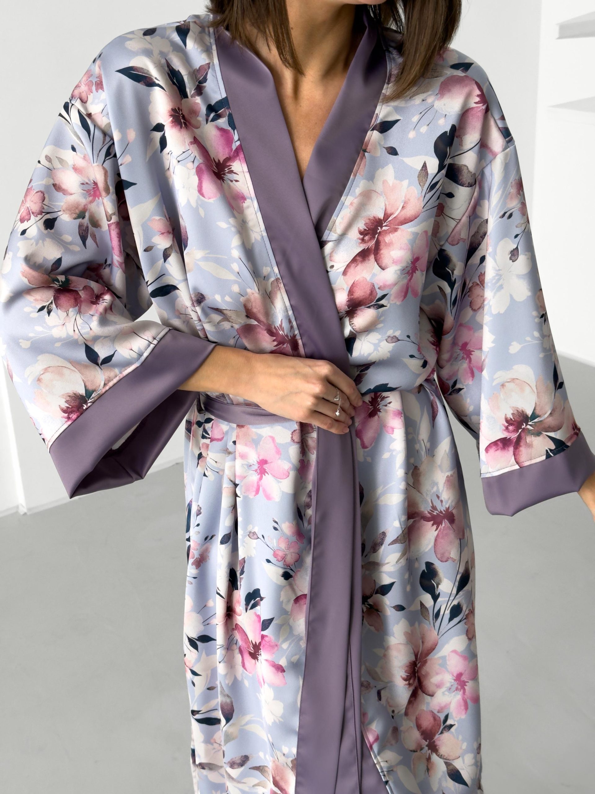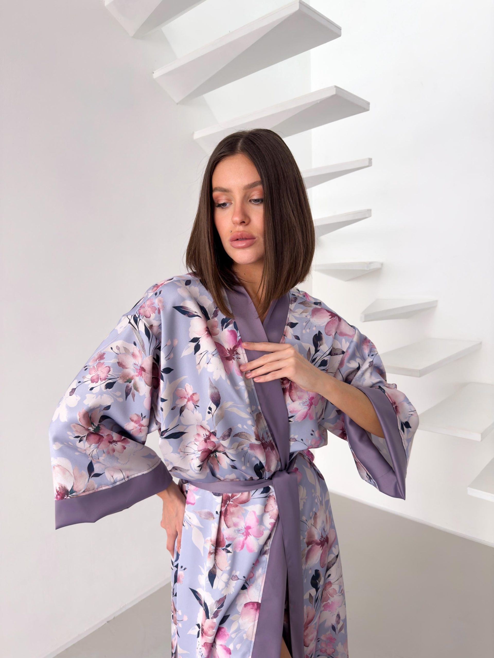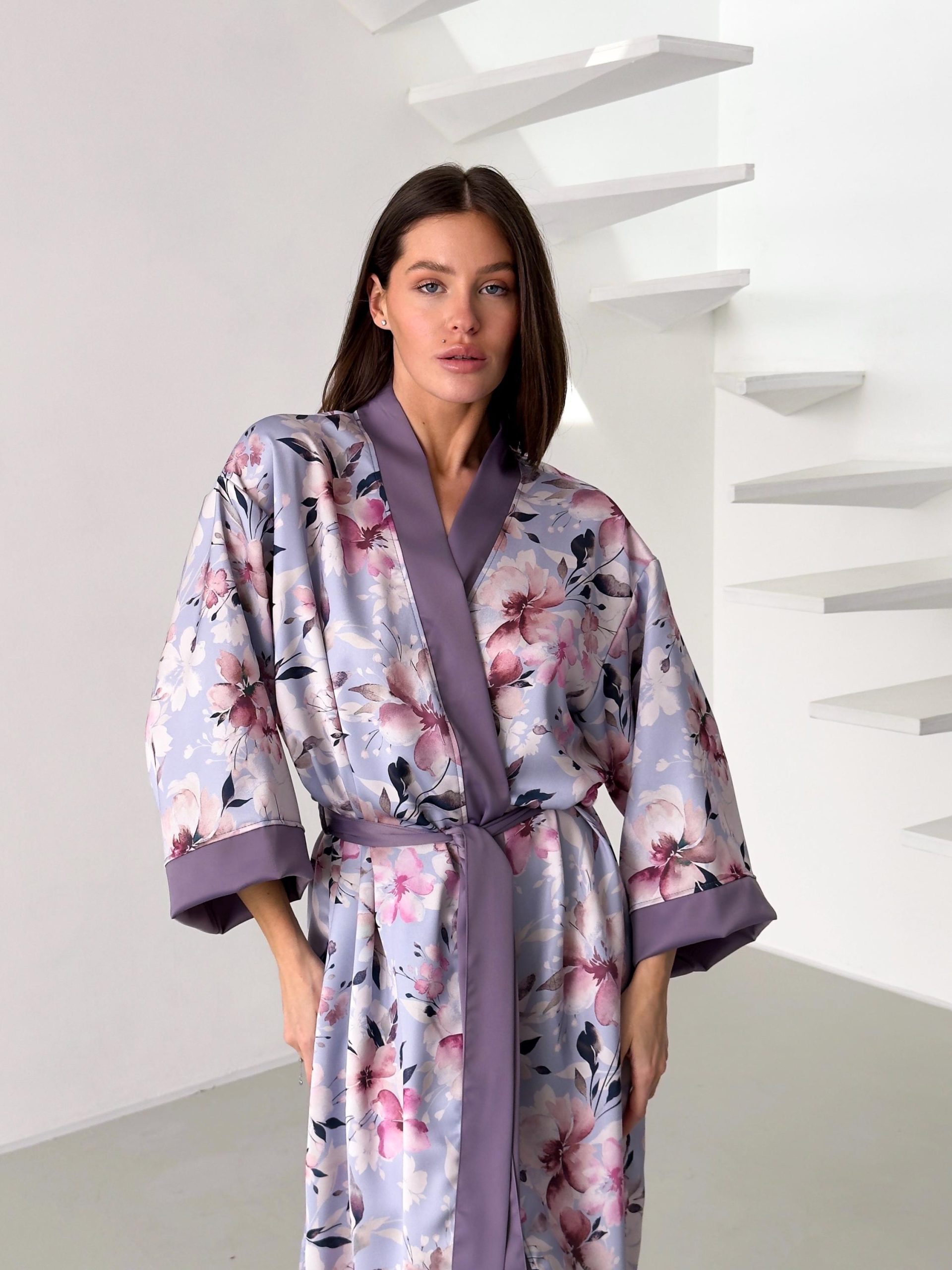 Step into serenity with this lavender satin kimono robe, designed to bring elegance, relaxation, and timeless beauty into your daily routine. With its delicate pastel floral print set against a soft lavender background, this robe transforms your morning coffee or evening wind-down into a moment of pure self-care.