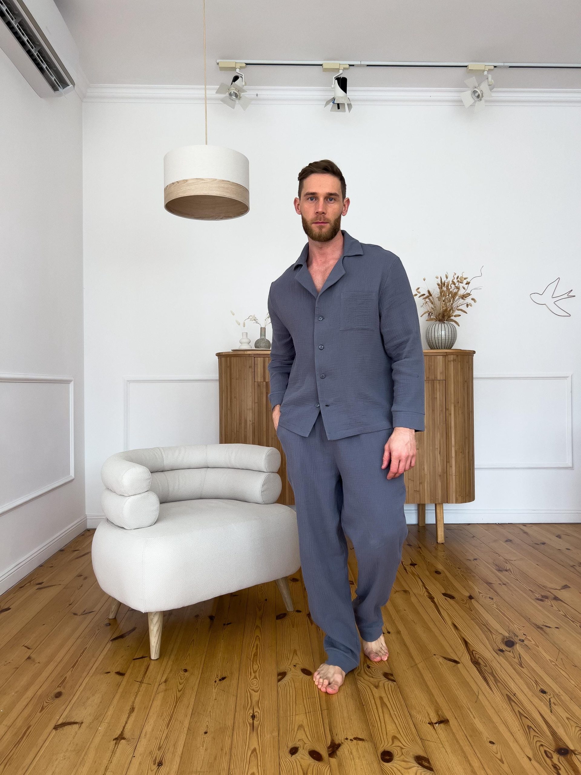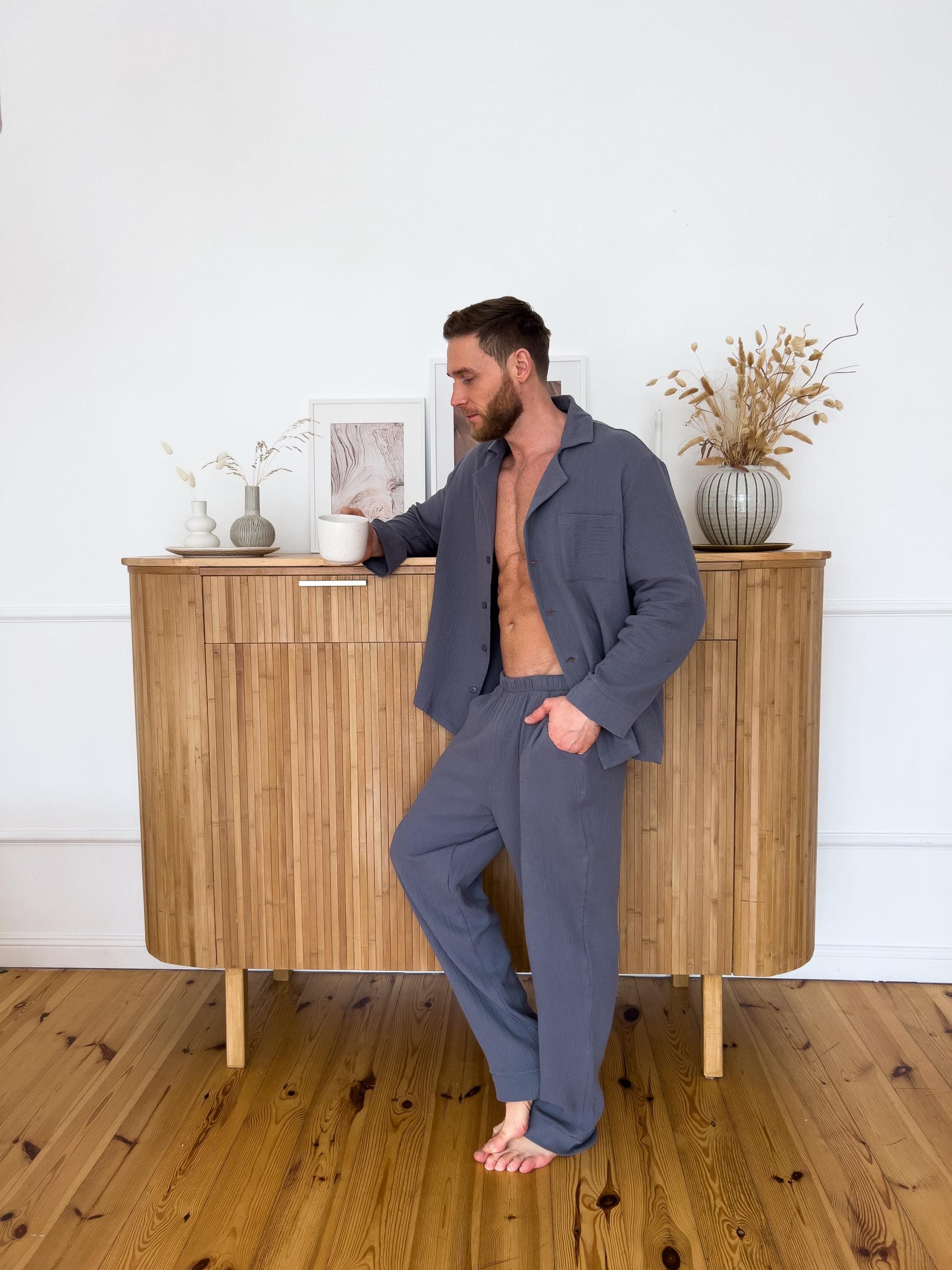 Stay cozy and comfortable at home with this Men’s Muslin Pajama Set, featuring a long sleeve button-up shirt and relaxed-fit pants with an elastic waistband and side pockets. Made from 100% double-layered cotton muslin, this set is breathable, soft, and perfect for year-round lounging or sleeping.