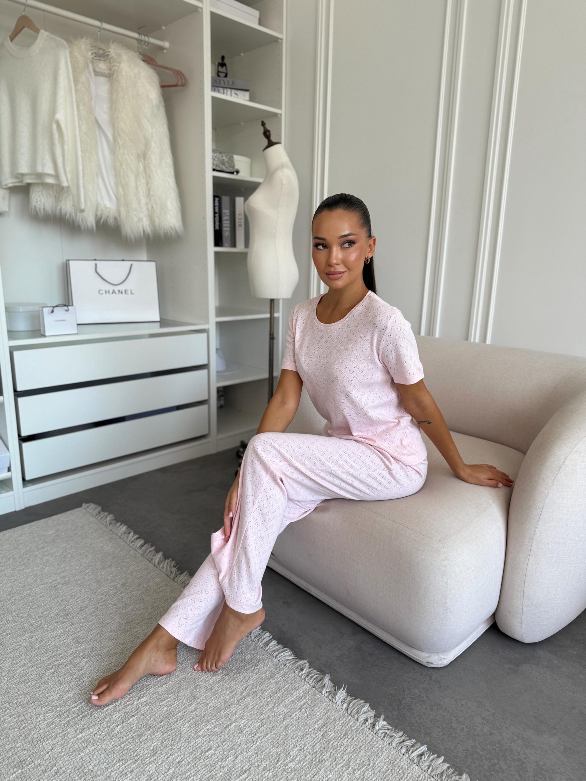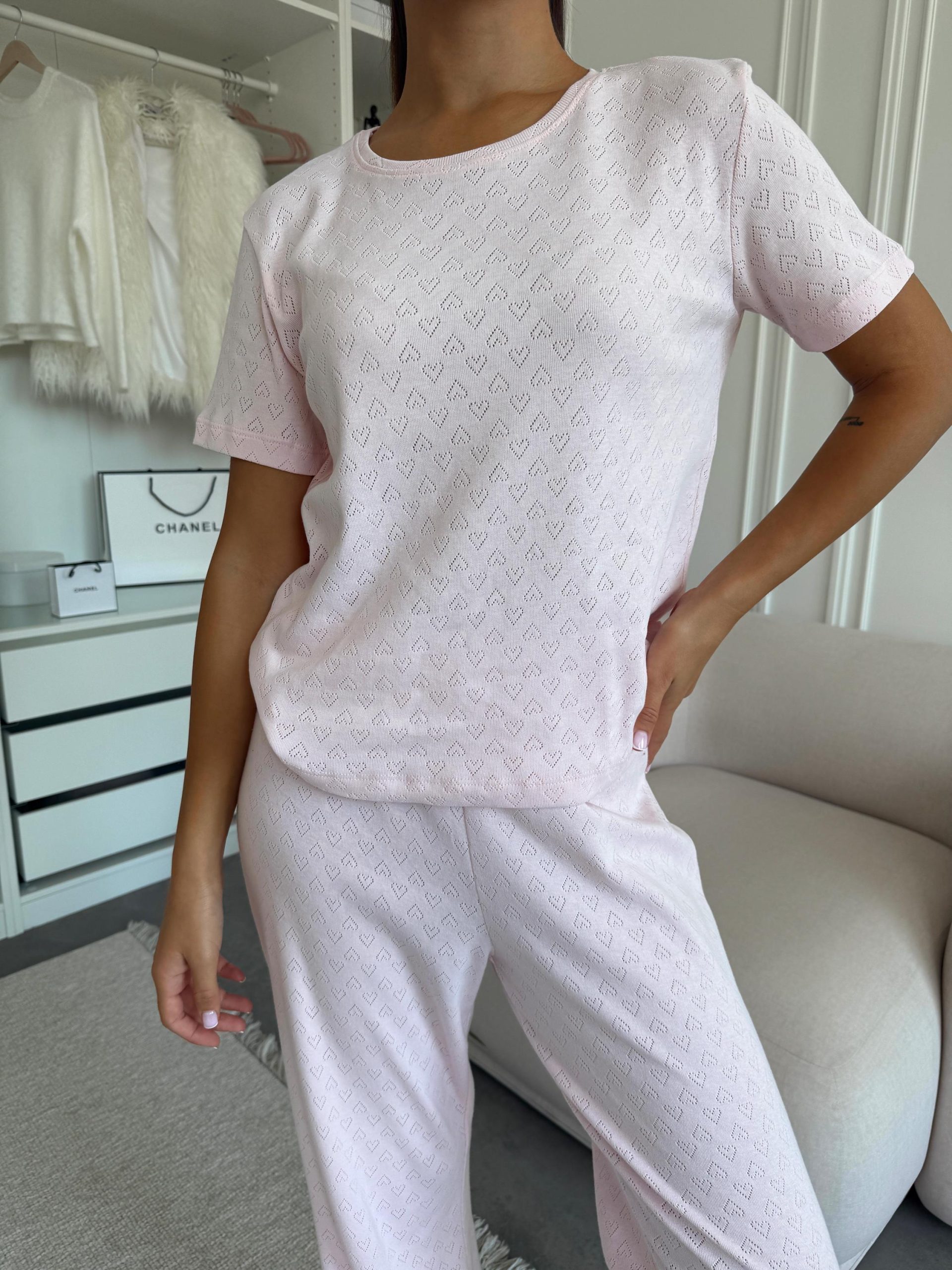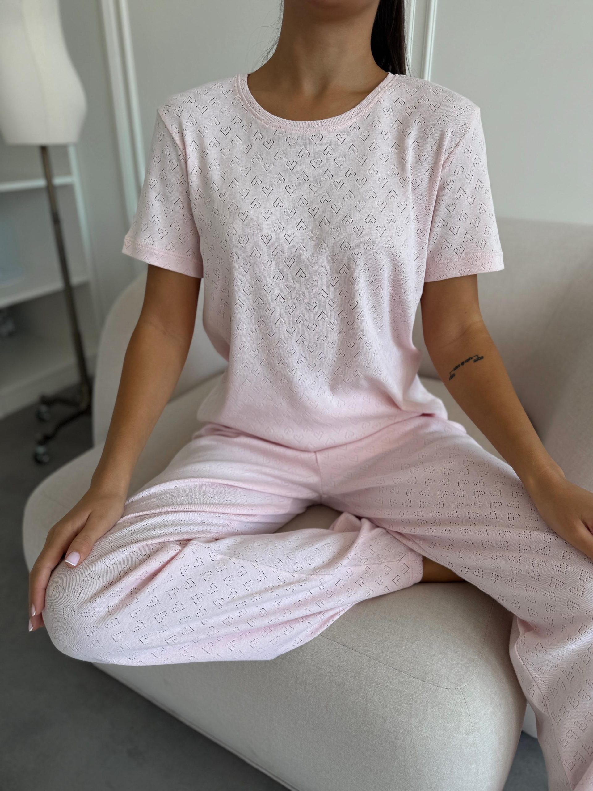 Enjoy lightness, comfort, and romance with the Rose Amour pajama set, featuring a short sleeve T-shirt and relaxed-fit pants made from 100% breathable cotton (transfer ribbed knit).