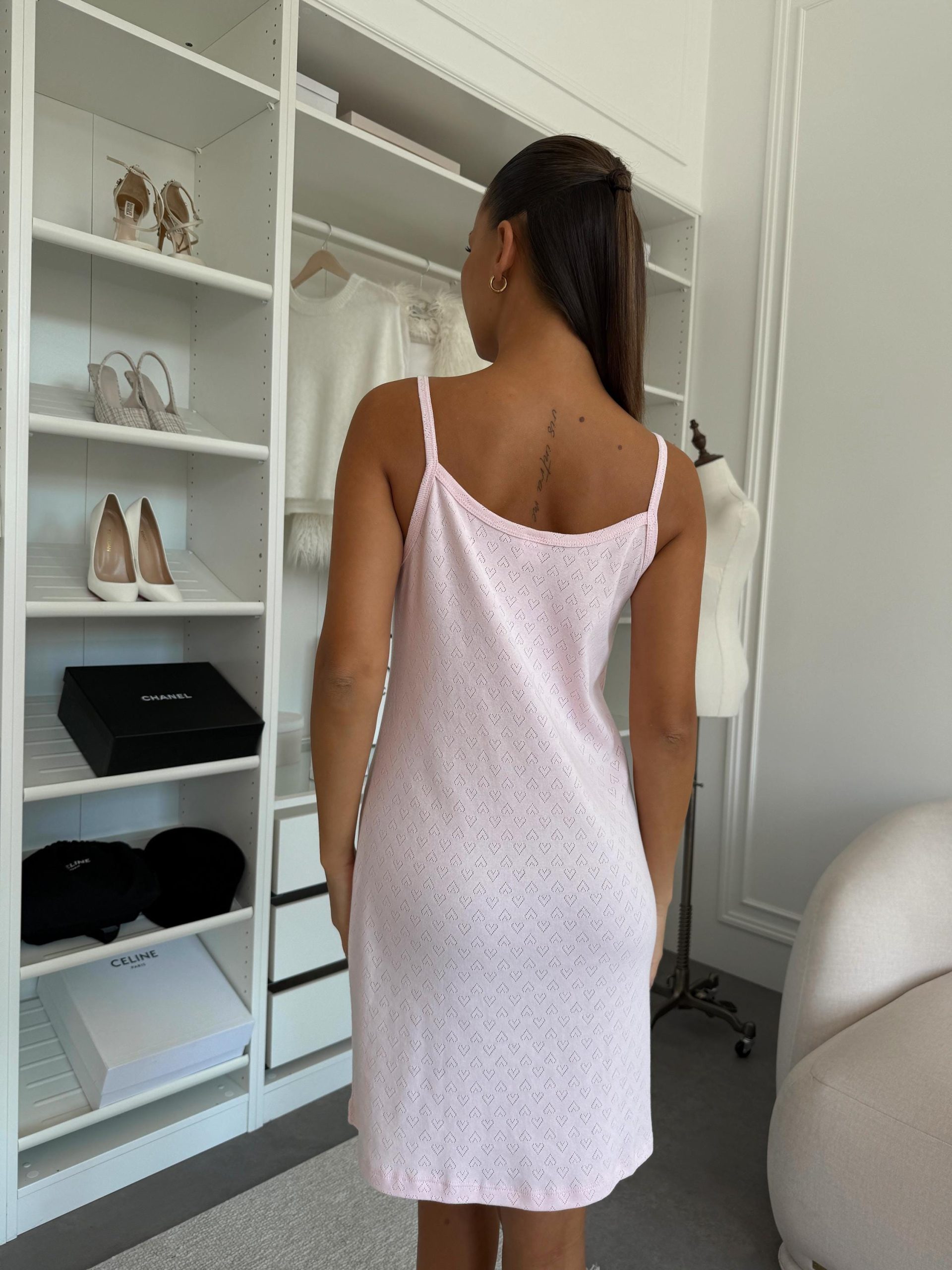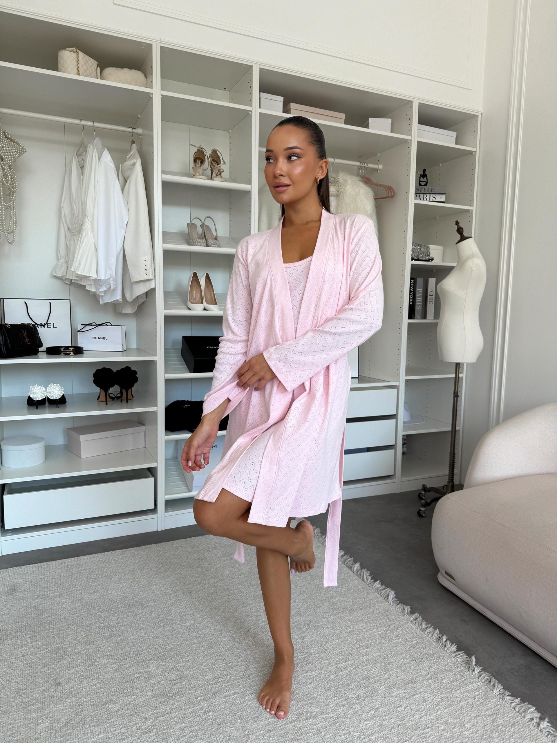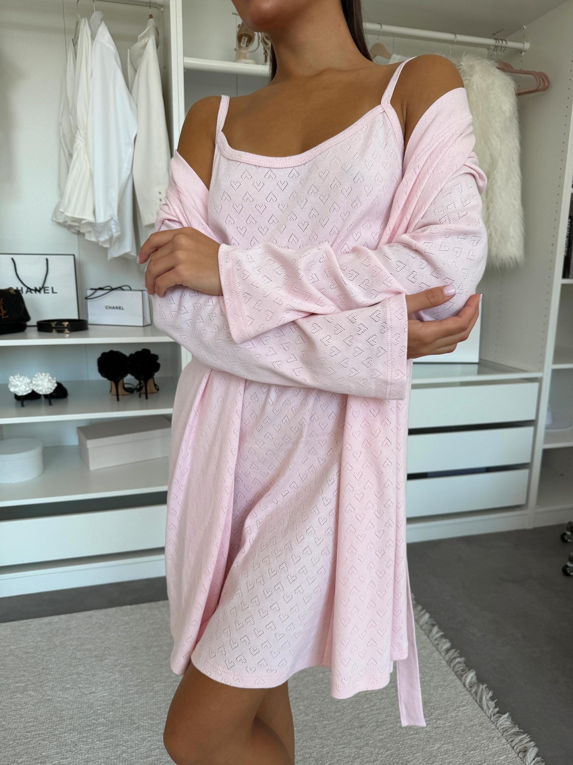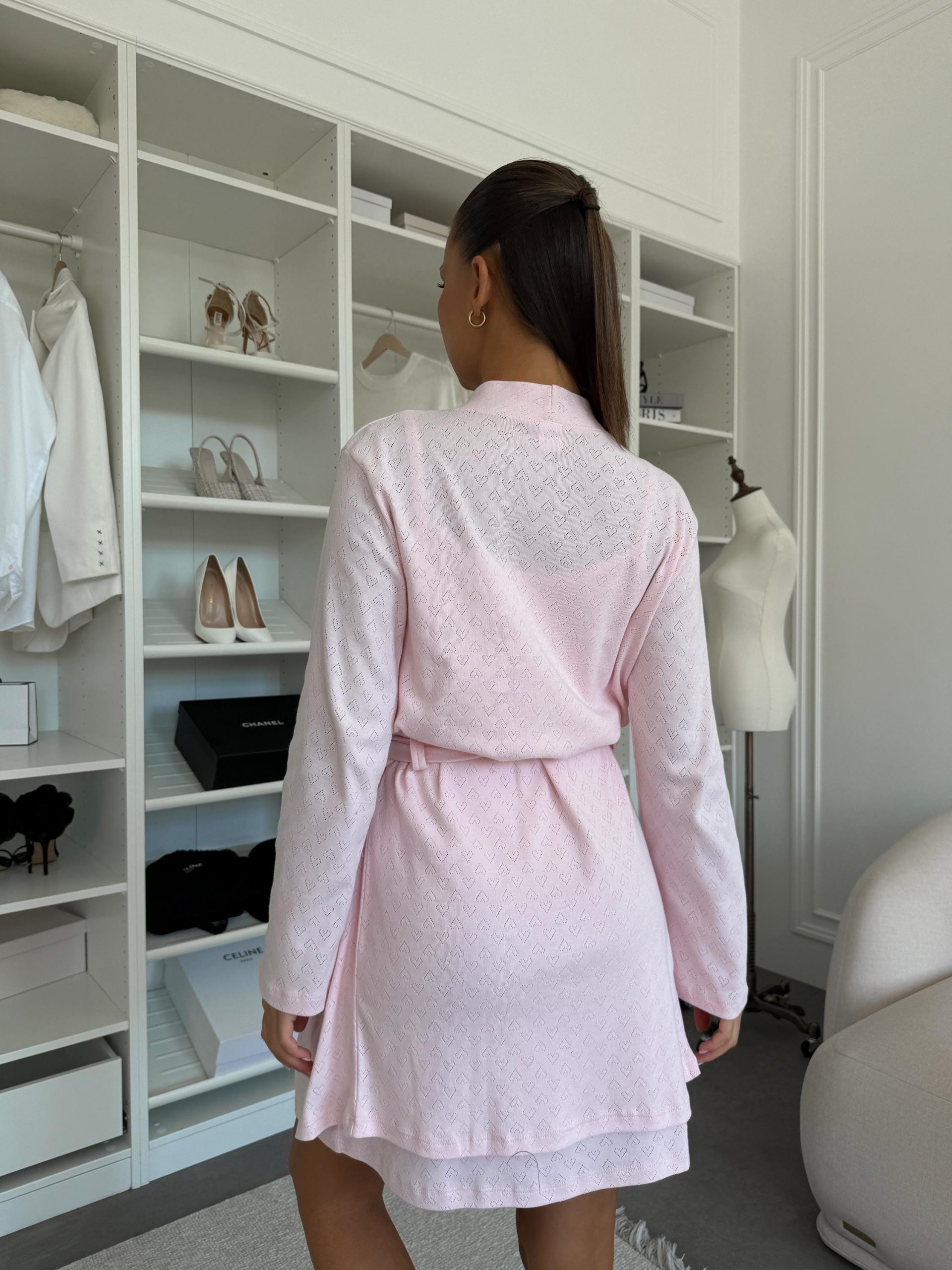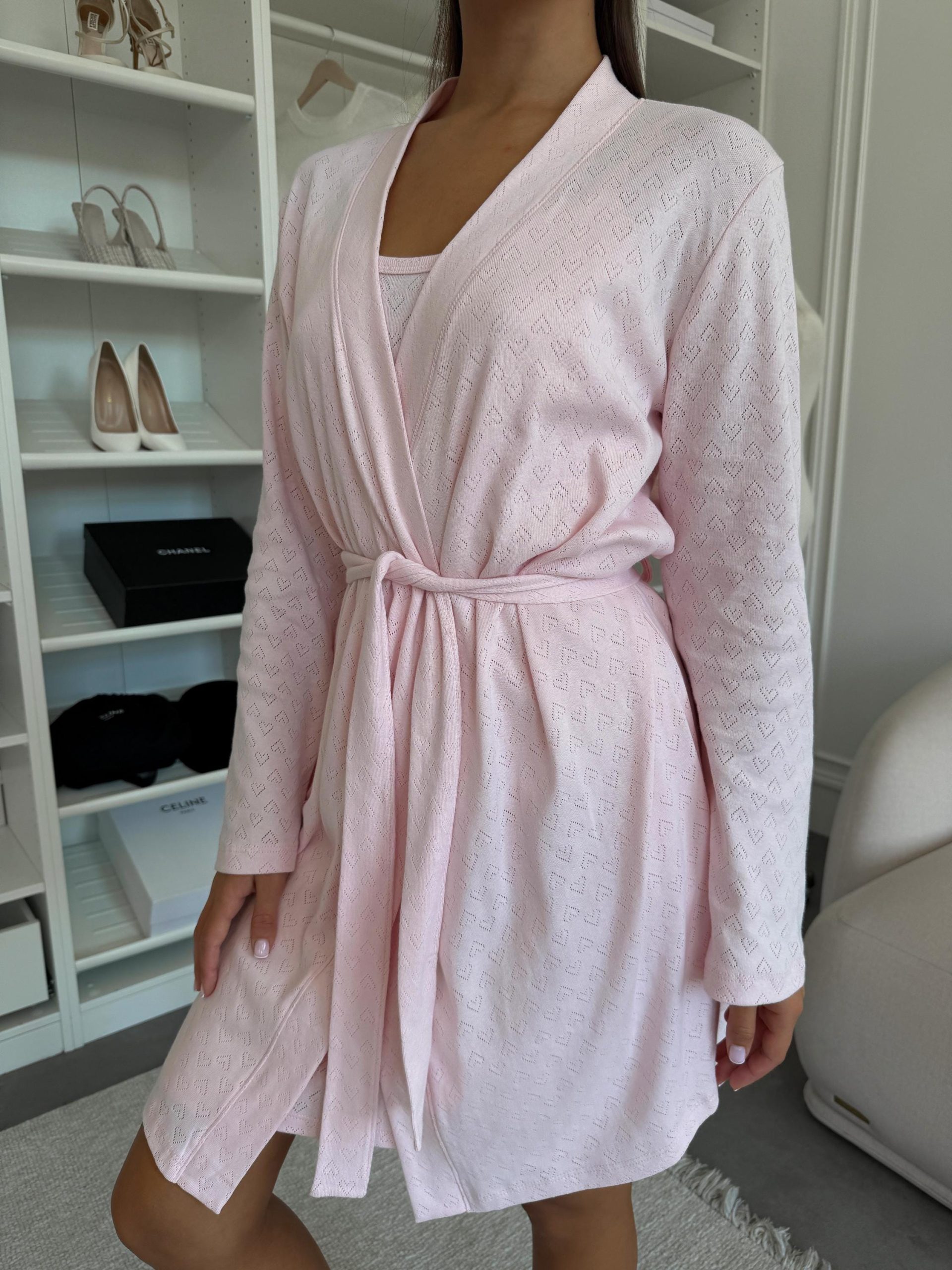 The romantic blush pink shade with delicate heart pattern and subtle perforated design creates a graceful, feminine look. A light robe with long sleeves (85 cm length, 55 cm sleeve) pairs perfectly with a cami slip dress (83 cm length) for a harmonious duo — ideal for home wear, cozy evenings, or intimate moments of relaxation.