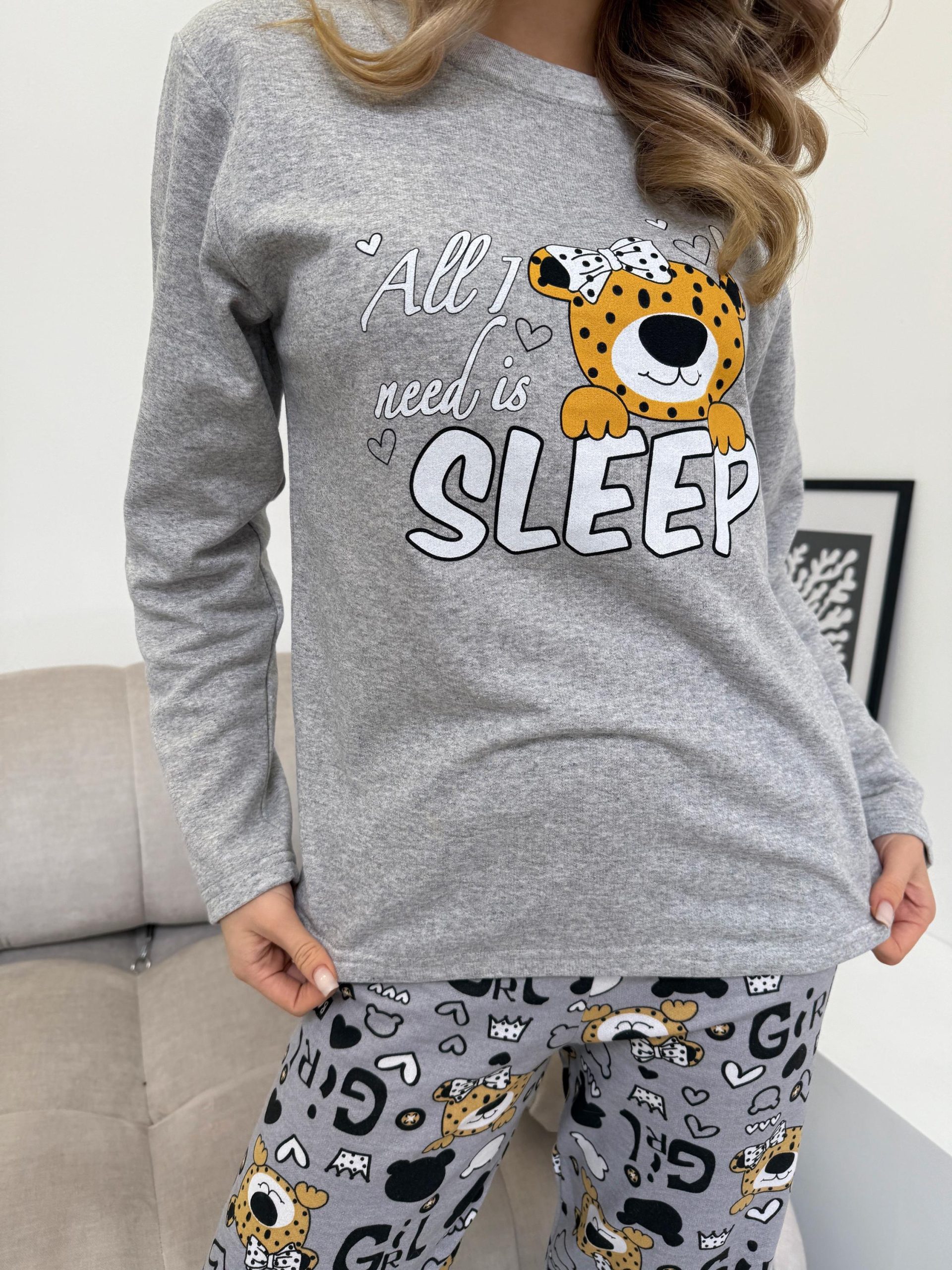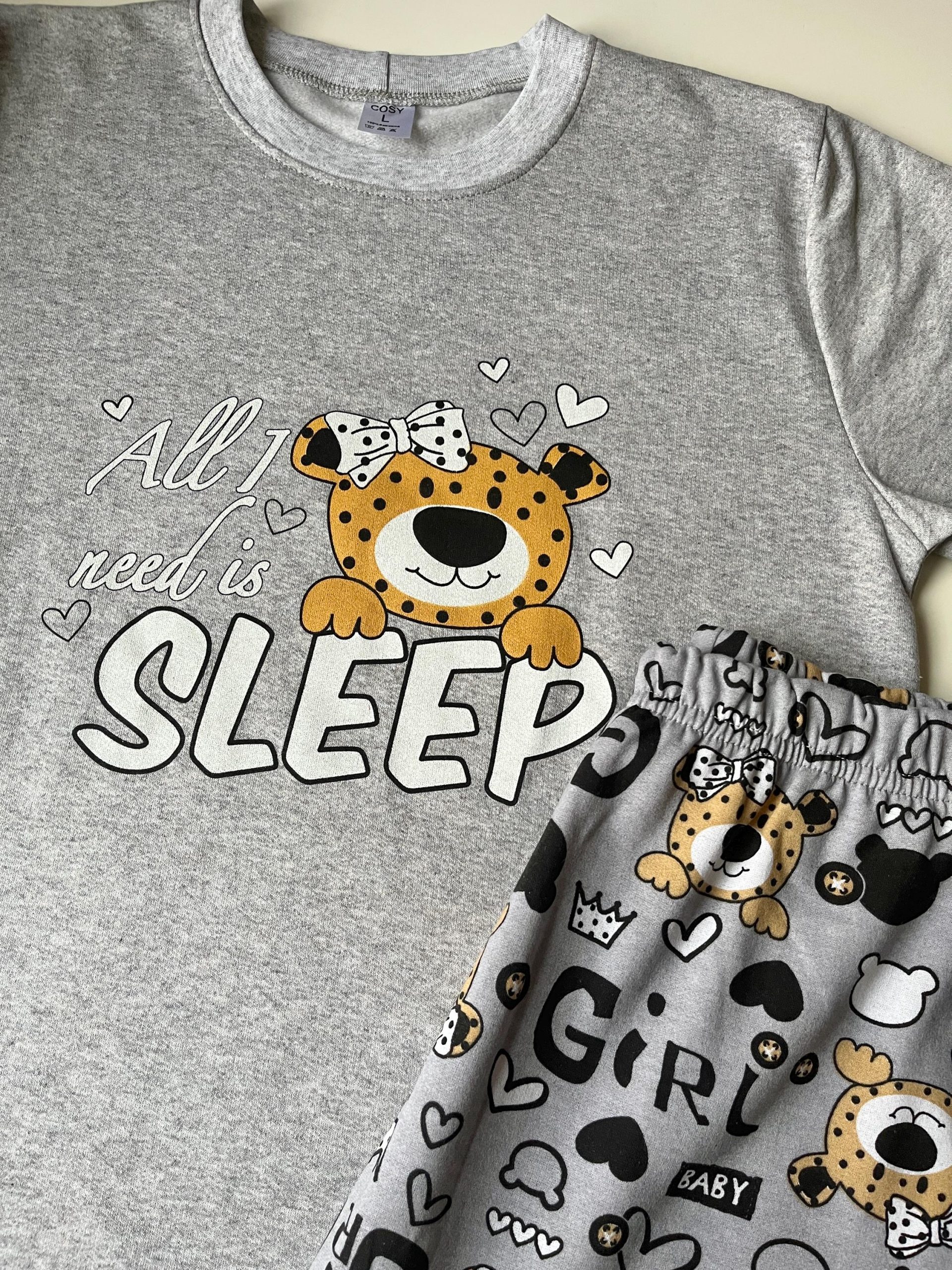 Soft & Warm Leo Print Pajama Set, Cozy Grey Cotton Fleece Sleepwear With Print, Cute Animal Print Pjs, Gift For Her, Long Sleeve Pajama Set